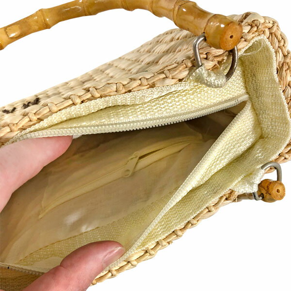 持ち手は竹製でクラシカルな雰囲気がGOOD!! それでいて便利な飛び出し防止のチャック付き 使い心地も良好 携帯や小物を持ち歩くのに最適なバッグです。
