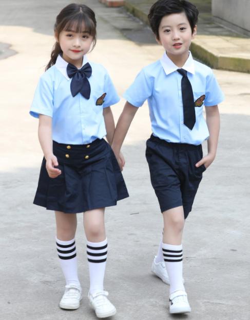 二枚送料無料 水色白2色 夏半袖子供ジュニアスーツ上下2点セットアップ イギリス風女の子セーラースカート男の子ショートパンツセット 入学式発表会学園際イベント舞台ダンス衣装 チアリーディング